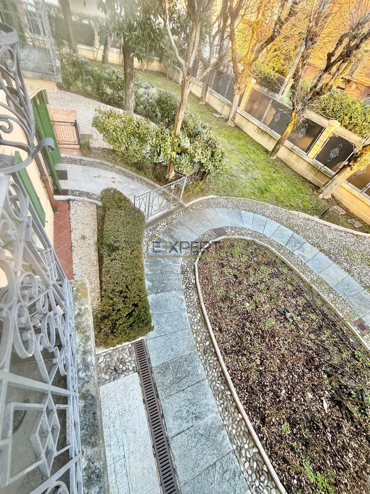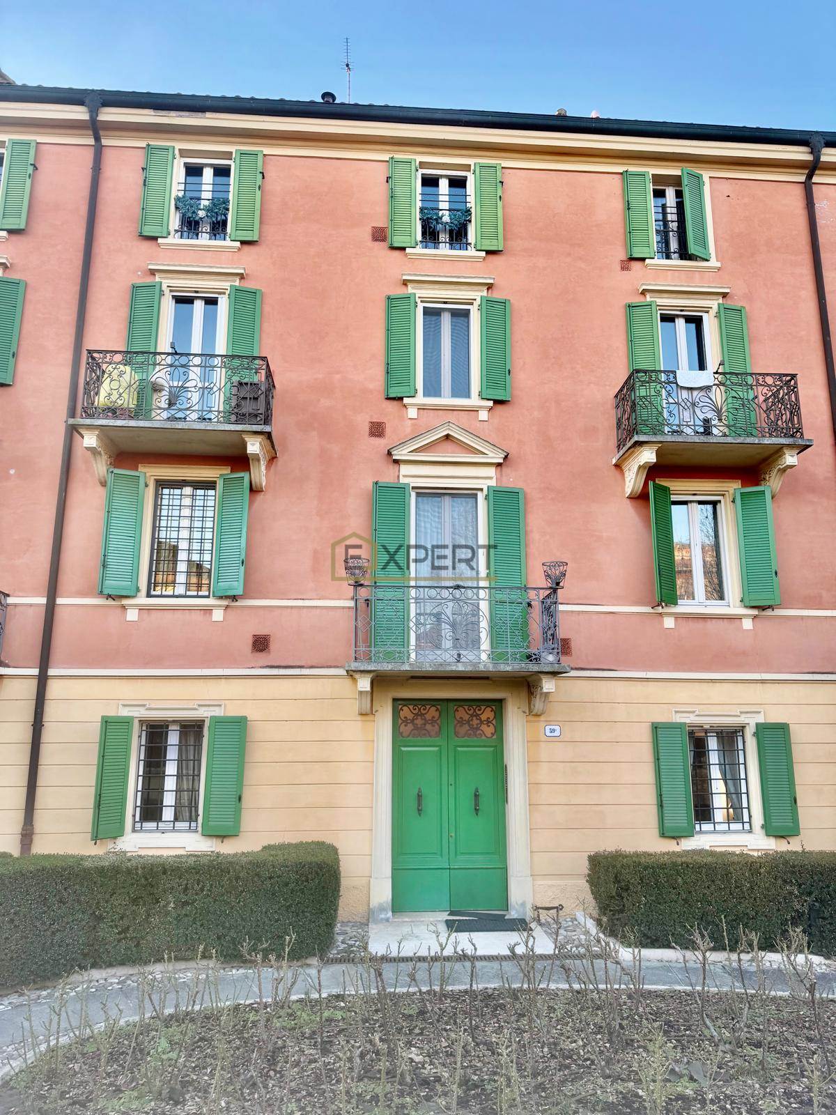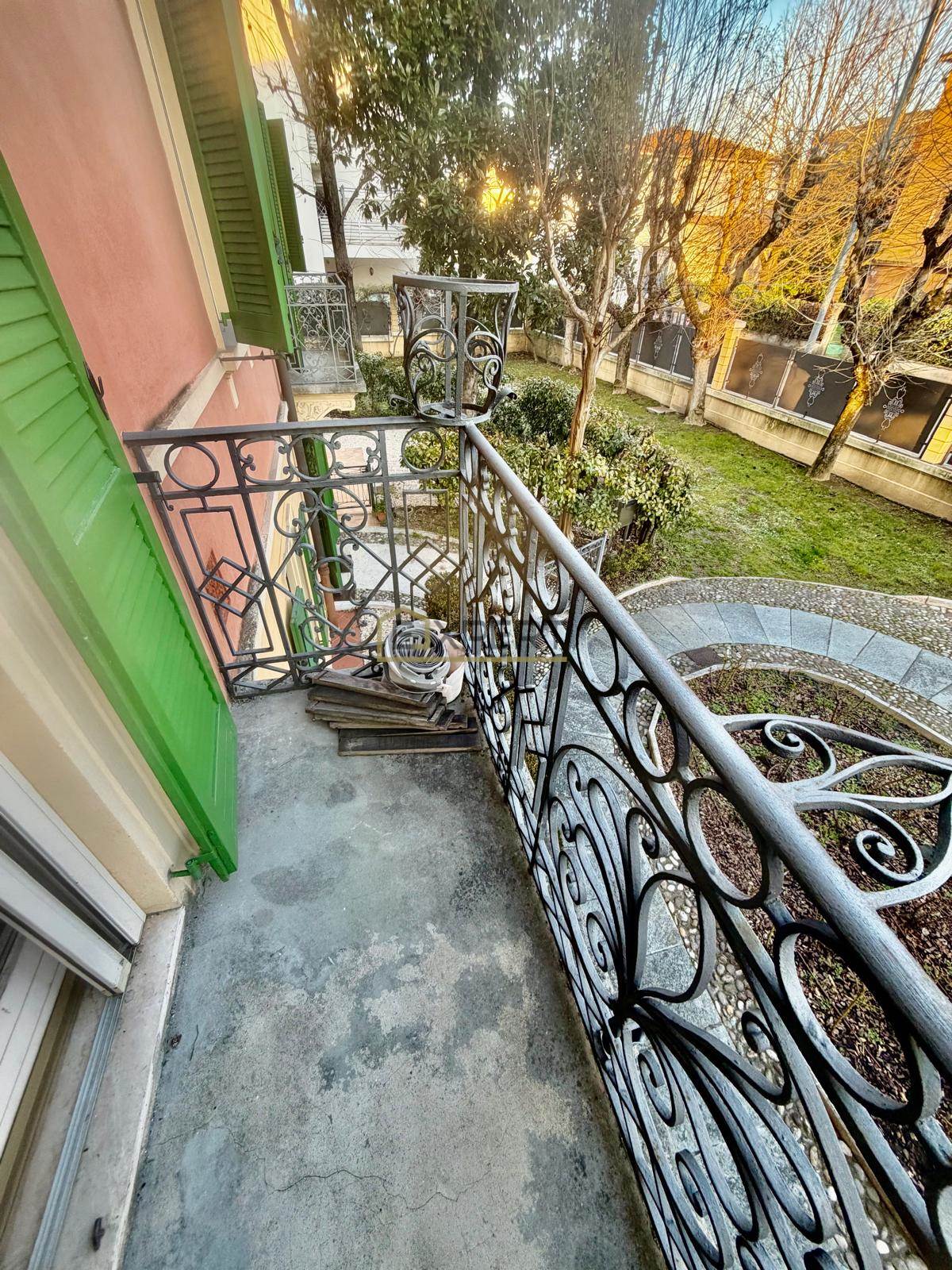 Apartment for rent on the first floor of a historic villa located in the Parco Ferrari area in Modena. The property has independent heating and is delivered furnished. The internal layout includes an entrance, a living room, a kitchen, two bedrooms (one single), a storage room, a bathroom, a balcony, and a free parking space. Available starting from February.